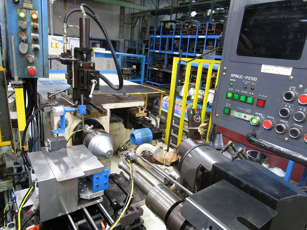NCスピニングマシン(自動絞り機)を5基保有し、様々な大きさの絞りに対応可能です。主に高純度アルミ材の絞りを得意としています。