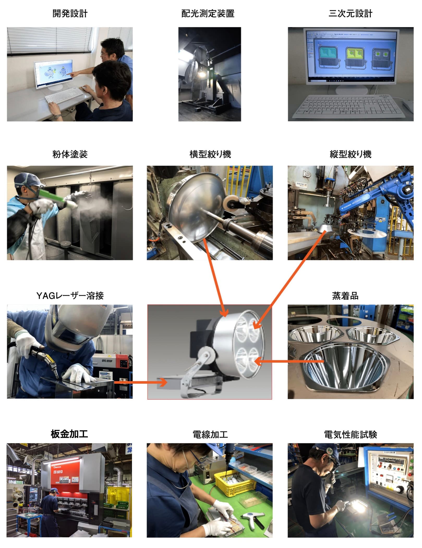 当社のLED照明製品は省エネ効率が高く特に大型施設や屋外の高所で使われる製品が主力で、 大手電機メーカーのOEM生産(取引先ブランドで製造する製品)が中心です。客先ニーズに合わせた 部品や製品の設計・試作・評価から量産までを担当しております。LED照明器具用の光源部と電源は 外部調達し、アルミダイカスト部品は海外調達をしています。量産品から特注品・小ロット対応まで行える 管理力・生産設備を備えた製造メーカーです。 工場では、塑性加工(Plastic working) に関しては、絞り加工・プレス加工・板金加工. 表面処理加工(surface treatment)については、真空蒸着・塗装設備を有しており、 電安法にもとづいた組立(Assembly)まで一貫生産を行えることが、リードタイムの短縮や輸送コスト 削減に繋がります。
